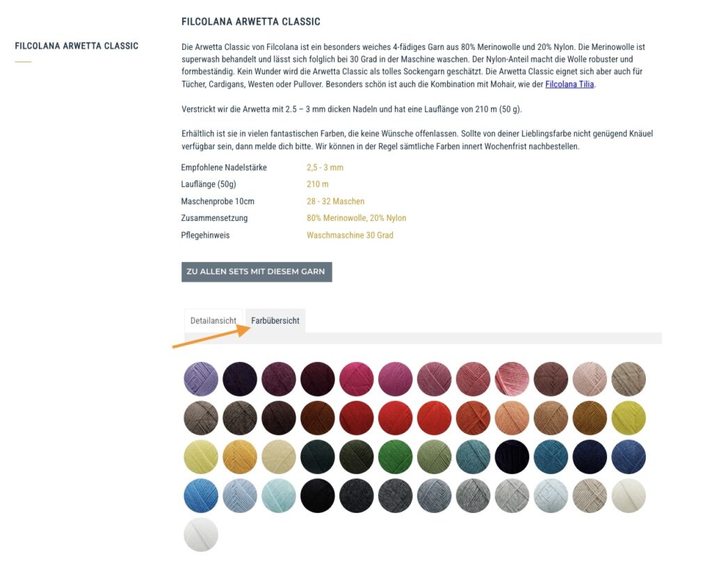 Im Shop haben wir gleich zwei Neuerungen vorgenommen. Neu seht ihr auf einen Blick alle verfügbaren Farben einer Qualität (nicht nur wenn ihr ein Strickset zusammenstellt, sondern neu auch, wenn ihr durch die einzelnen Wollkategorien klickt). Der Reiter Farbübersicht wird euch dann angezeigt, wenn ihr euch auf der untersten Kategorie-Stufe befindet (also z.B. bei der Filcolana Arwetta Classic) und auch wenn ihr eine einzelne Farbe geöffnet habt.