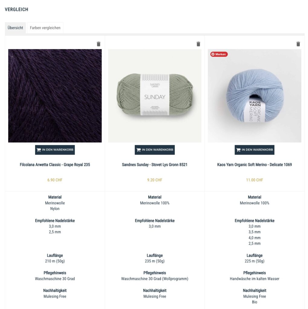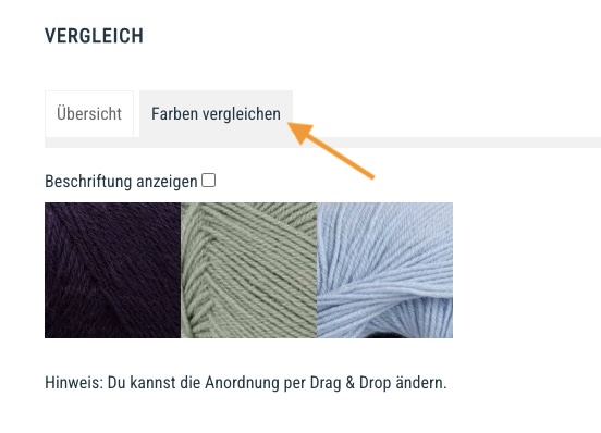 Neu hast du zudem auch eine Vergleichsfunktion. Mit dem Symbol der gegeneinander zeigenden Pfeile kannst du den gewünschten Artikel zur Vergleichsliste hinzufügen. Dort siehst du auf einen Blick, inwiefern sich diese unterscheiden. Zudem kannst du auch dort auf „Farben vergleichen“ klicken. Dann siehst die ausgewählten Farben direkt nebeneinander und kannst deren Reihenfolge mittels Drag & Drop verändern.