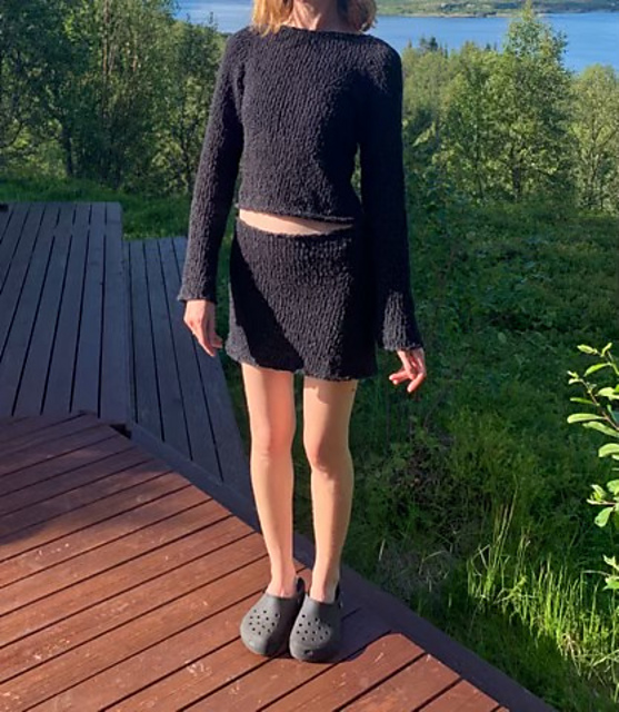 Es wird nahtlos von oben nach unten gestrickt mit zarten Kanten und soll mit ein wenig Bewegungsspielraum getragen werden.