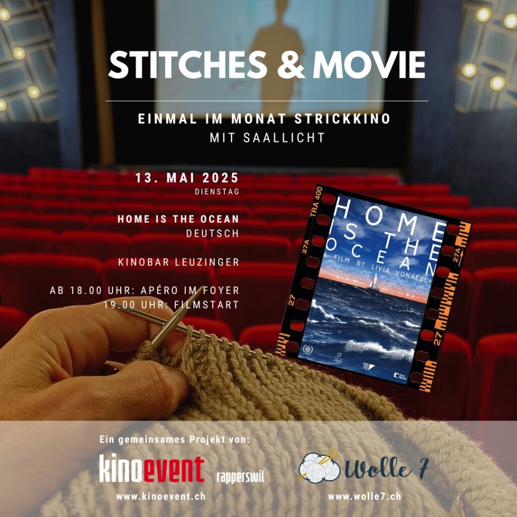 Nicht vergessen: Am Dienstag, 13. Mai findet die nächste Ausgabe unseres Stitches & Movie Event im Kino Leuzinger in Rapperswil statt und wir werden den Film „Home is the Ocean“ schauen. Du bist herzlich eingeladen mit uns den Film zu schauen, zusammen zu stricken/häkeln/sticken oder was dein Herz begehrt und Popcorn oder ein Glacé zu naschen! 😉 Weitere Infos und Tickets findest du direkt bei Kinoevent.